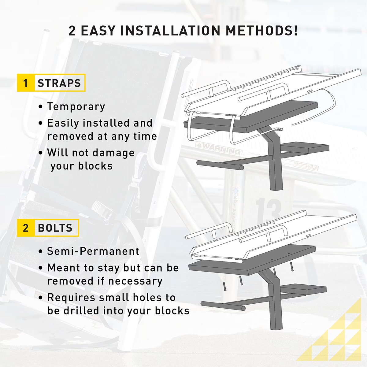 Bục xuất phát bơi di động FINIS được thiết kế để lắp đặt trực tiếp lên bục xuất phát hiện có thông qua hai phương pháp: